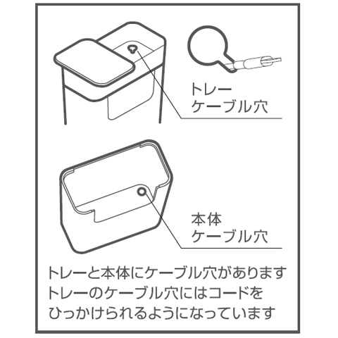 トレーと本体にケーブル穴があります。トレーのケーブル穴にはコードをひっかけられるようになっています。