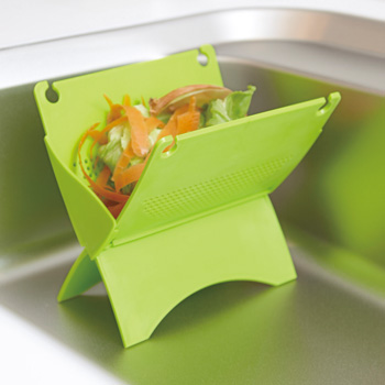 シンクに溜まった生ゴミをギュッとはさみこんで、水気を切れば約10%ダイエットしてゴミの減量化ができる、新発想の水切り器。そのままでも、市販の水切り用袋を装着しても使えます。また、分解できるので、手軽に洗って清潔に保てます。折りたためばスリムに変身するので、場所を取らずに収納できます。エコにも貢献、新鮮なフォルムも楽しい、次世代のキッチンアイテムです。 |